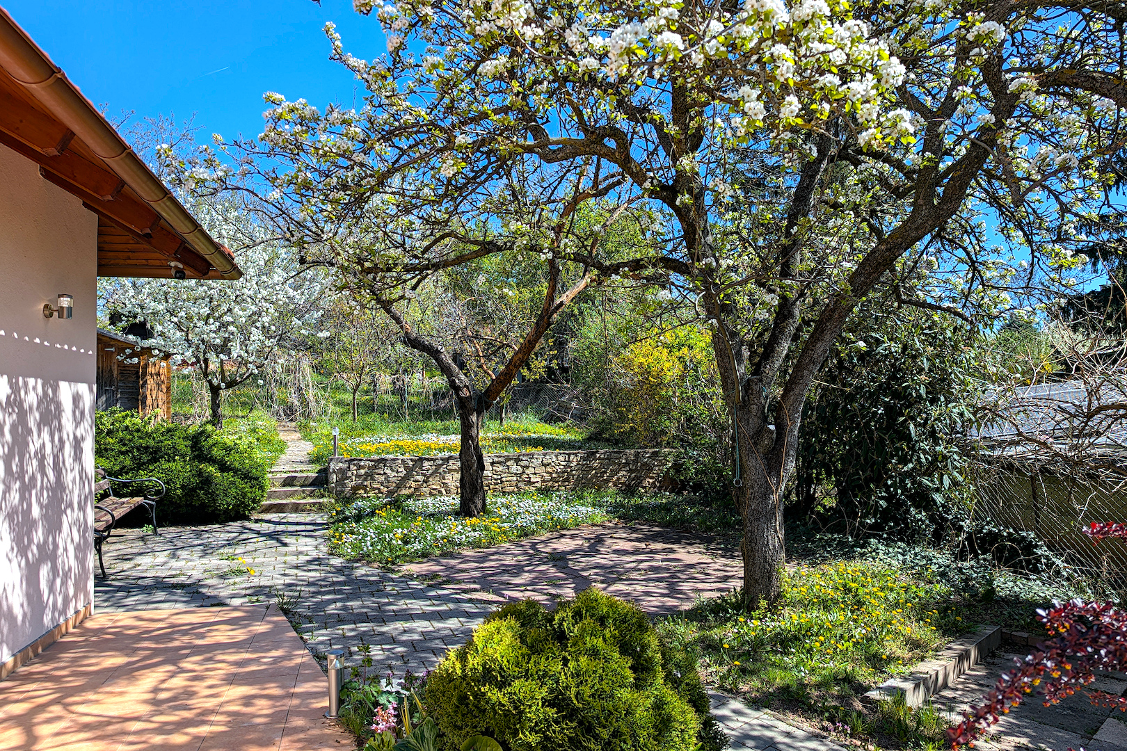 A telek átlagos, nem is nagy nem is kicsi. Ennek ellenére a túlzsúfoltság érzése nélkül fér el rajta az épület, a két autó számára épített fedett beálló, a terasz, az elő- oldal- és hátsókert. Elegáns és stílusos kerítés zárja az utca irányából. A fák, a bokrok és a gyep rendben tartása bizony ad munkát, de cserébe egy nagyon hangulatos, nagyon élhető természetes szabad tér alakul ki a ház körül, lehetővé téve az itt élők számára, hogy tavasztól őszig kint létezhessenek, csupán aludni menjenek be a házba.